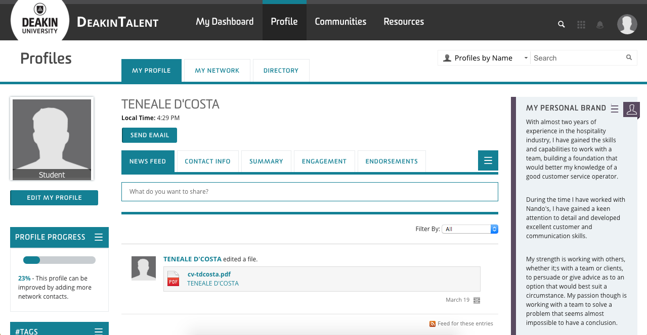 The employers and communities I have joined all connect back to the degree that I have a goal of completing. They include Telstra Corporation Ltd, Computer Science & IT (Deakin), Faculty of Science, Engineering and Built Environment (Deakin), Cisco Systems, Leidos, and The Australian Federal Police (AFP).